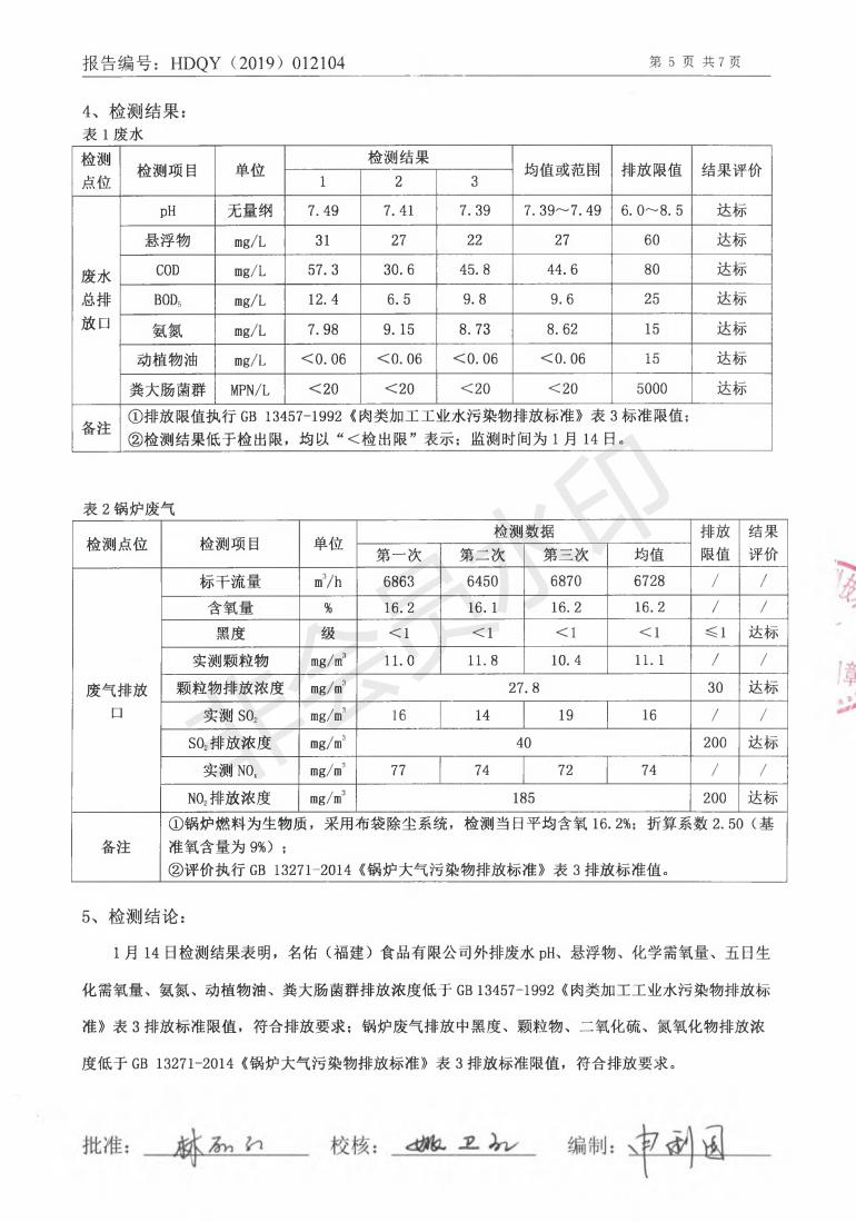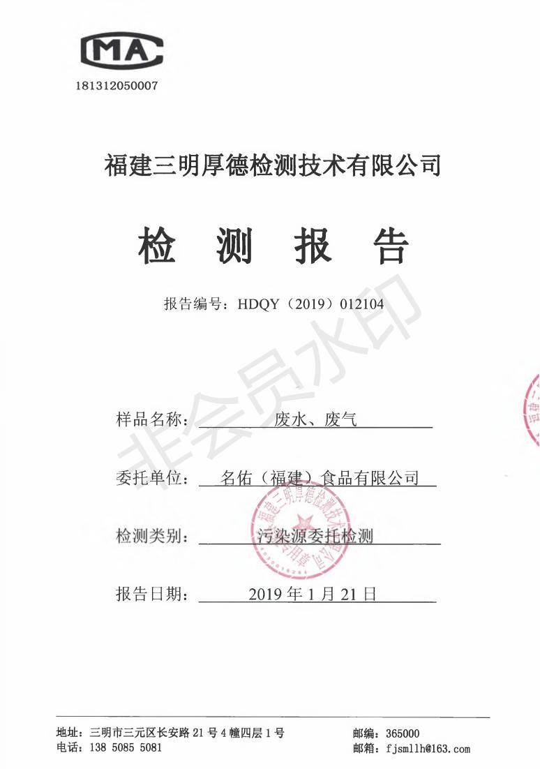名佑(福建)食品有限公司2019年度1月環境自行監測信息