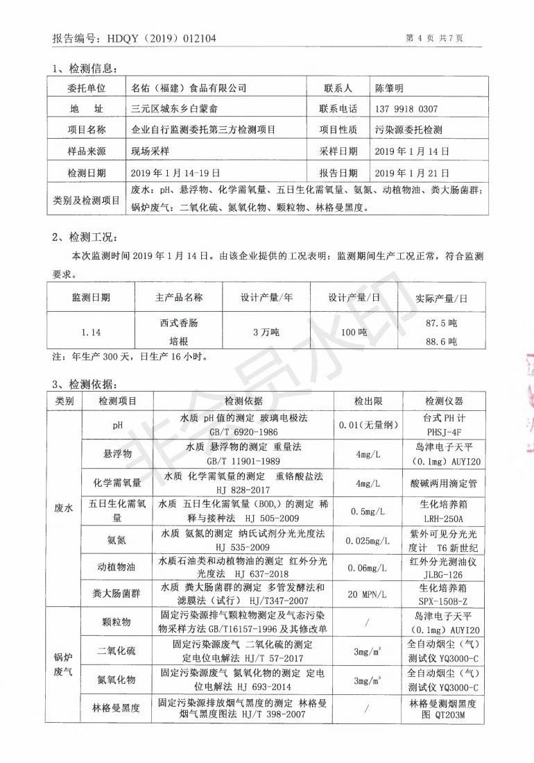 名佑(福建)食品有限公司2019年度環境自行監測方案信息