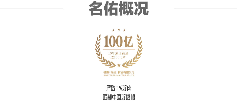 名佑(福建)食品有限公司從原料采購到生產加工過程,建立全程質量追溯體系,主營培根系列產品經過21道嚴苛生產工序(分割-配料-滾揉-裝模-煙熏-脫模-切片-裝袋-真空-裝箱等21道工序),生產出高質量產品。公司先后獲得“農業產業化國家級重點龍頭企業”、“省級重點龍頭企業”、“福建省科技小巨人領軍企業”、“福建省科技型企業”、“福建省西式肉制品生產標桿企業”等榮譽稱號。名佑參與培根、火腿國家標準制定,核心產品“經典培根”,被評為“福建省名牌產品”,榮獲《ITQI國際頂級美味獎章》,憑借著專業和美味受到了國內外餐飲行業的一致好評。