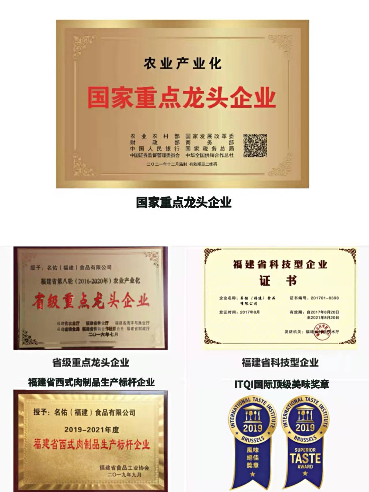 公司沿著“品牌化運作,職業化經營”戰略思想,在全體員工的共同努力下,“名佑”牌培根市場占有率不斷攀升,成為全國較大低溫西式肉制品培根制造商,不斷得到社會認可和政府支持。公司被授予“農業產業化國家級重點龍頭企業”、“全國模范職工之家”、“福建省民營企業黨建工作先進單位”“福建省守合同重信用企業”、“福建省科技小巨人領軍企業”、“福建省西式肉制品生產標桿企業”、“三明市十佳誠信用工企業”、“三元區納稅大戶”;公司“名佑”商標被評為“福建省著名商標”;公司經典培根被評為“福建省名牌產品”,榮獲《ITQI國際頂級美味獎章》,憑借著專業和美味受到了國內外餐飲行業的一致好評。